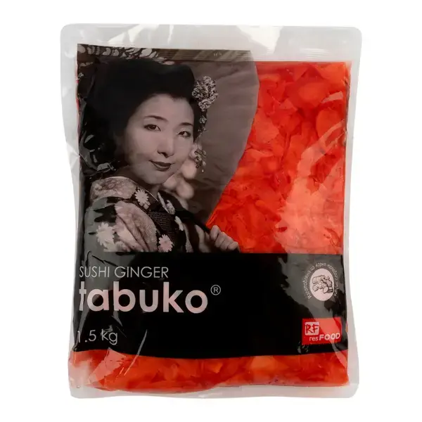 Вес : 1кг Вид упаковки : пластиковый пакет Страна-производитель: Китай Цена указана за 1кг Маринованный розовый имбирь Tabuko — это продукт китайского производства, который часто используется в японской и азиатской кухне. Он придаёт блюдам сладковато-острый вкус и помогает освежить вкусовые рецепторы между приёмами пищи